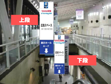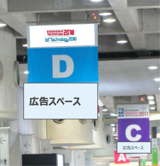 2階コンコースの天井吊りバナーに広告スペースをご用意。 カンファレンス会場や駅から会場にくる来場者の目に必ず留まります!