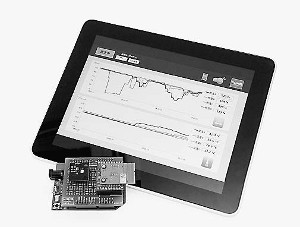 「センサーシールド」はグループ会社ラピスセミコンダクタの汎用マイコンボードを使って、最大8種類のセンサー測定を簡単に行える拡張ボード。