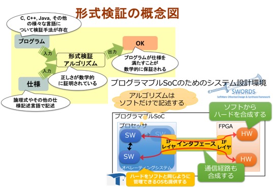 今回は (1) プログラムの形式検証手法(プログラムが正しく動作することを数理的手法によって保証する手法)を用いたプログラム検証ツール,と (2) 組込みリアルタイムシステムのための設計支援環境について,デモと動作説明を行います.形式手法に興味のある方,組込みシステムの設計環境に興味のある方,産学連携に興味のある方,大学の研究って役に立つの?と思われている方のご来場をお待ちしています.