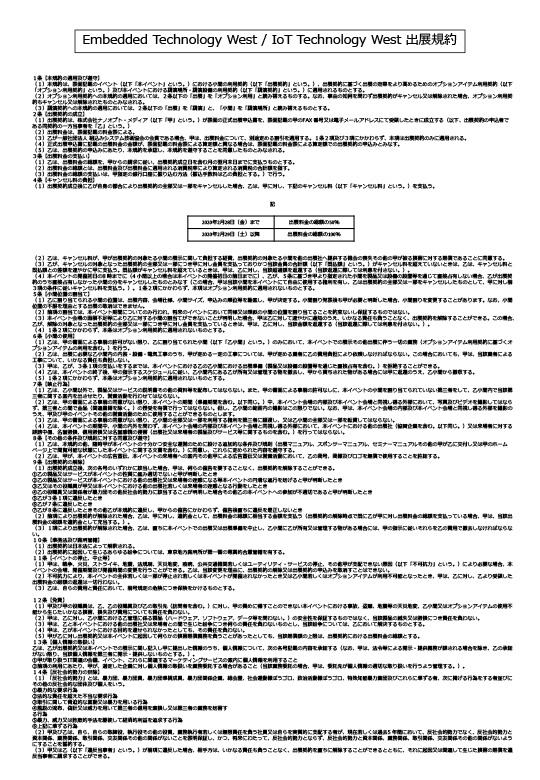 1)Embedded Technology(またはその一部)が、不可抗力事由により、開催または継続が不能または困難であると主催者が判断した場合、主催者は開催の中止または中断をすることができるものとします。出展者は、いかなる場合でもその決定により蒙った損害の損害賠償を主催者に対して請求することはできません。