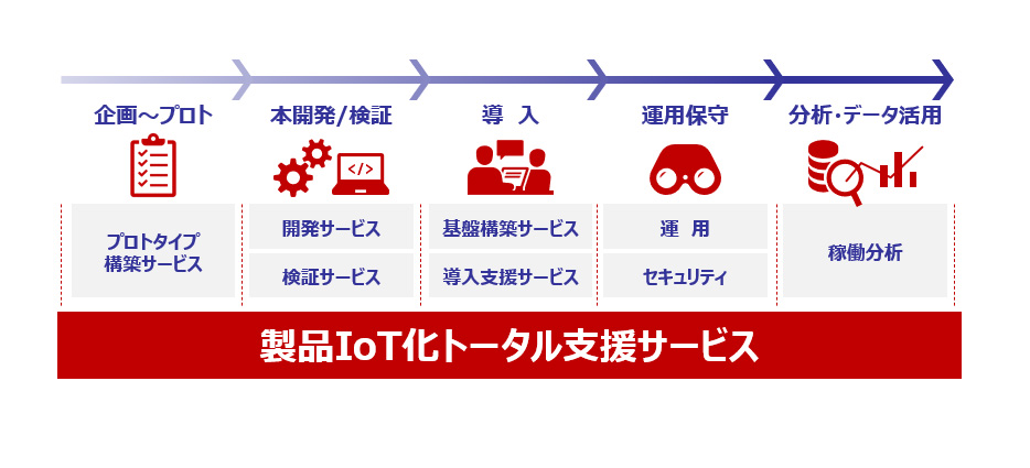 製品IoT化の企画段階~開発~運用、データ活用に至るまで、開発現場で発生するさまざまな技術課題に対して、各分野のプロフェッショナルによるトータルサポートをご提供します。