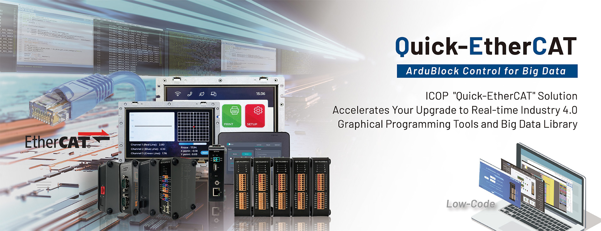 ICOP Technology provides a complete solution for EtherCAT — the QEC Series, which includes EtherCAT master motion controllers and EtherCAT slave modules (I/O, RS232/485, MPG, converters, motion control/drivers). With highly integrated hardware and software features, the QEC series supports a wide range of industrial automation applications and provides fast, simple, and often used/readily available functions while shortening development cycles. It can also build Database through MySQL library, which helps create smart IIoT technology.