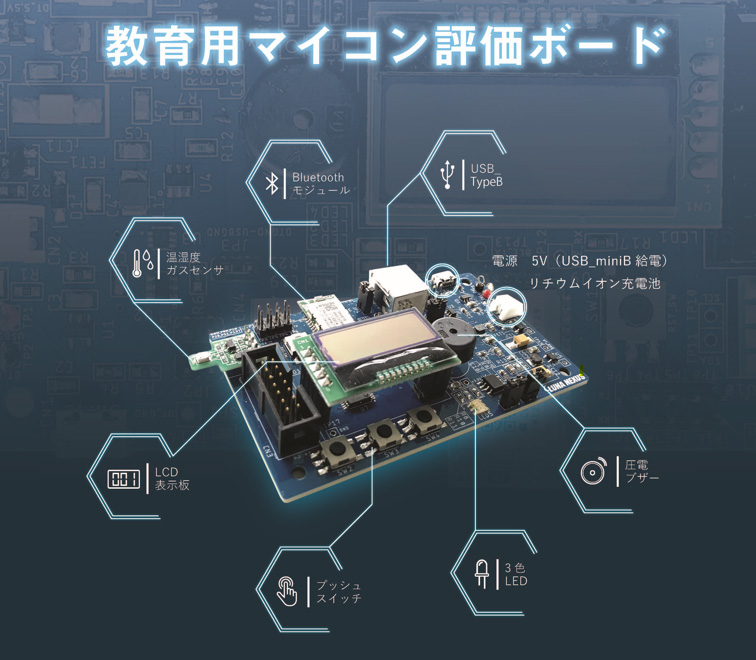 本展示会では、一例としてソフトウェア(F/W)の教育用に製作した「教育用マイコンボード」と、この基板を活用したシステム開発例を展示いたします。