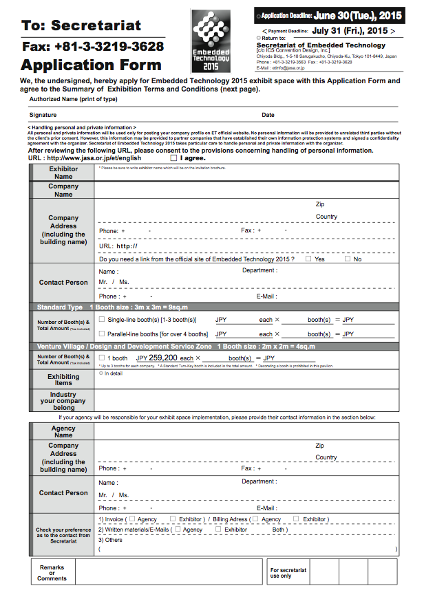 Invoice will be issued upon receiving an application form. Please deposit the exhibition fee to the bank account designated on invoice by the payment deadline.