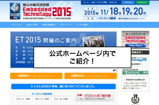 ET2015/IoT Technology2015で発表する新製品や、自社小間内で実施するプレゼン/デモ実施の情報を公式ホームページで紹介いたします。