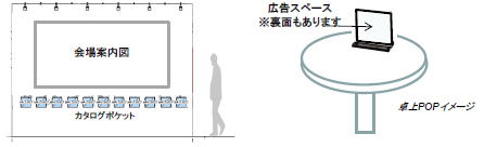 会場内ラウンジ(2箇所)での【カタログPRコーナー】【卓上POP】【動画放映*】をご用意します。