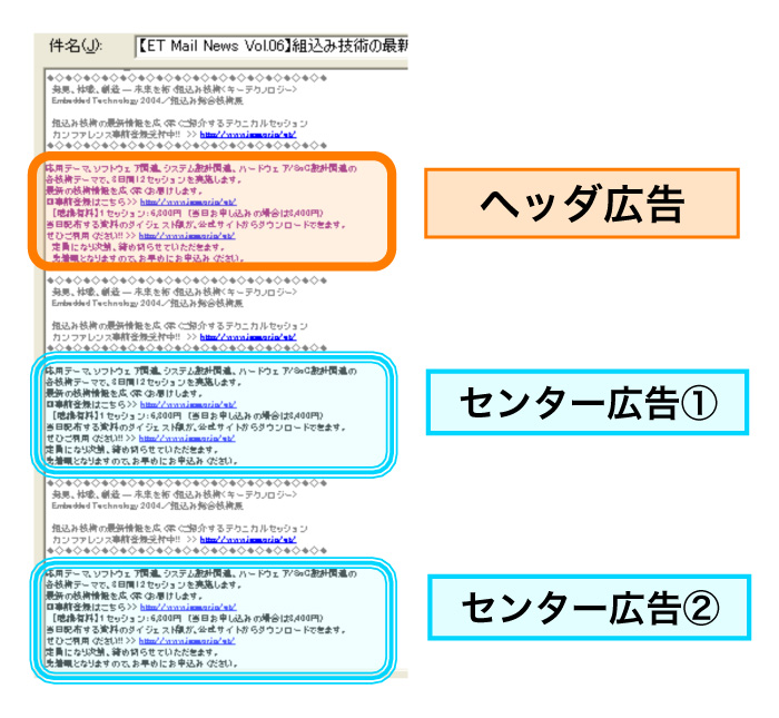 ・広告配信メールのトップにある「ヘッダ広告」と「センター広告」の2種類を設定します。