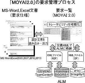 要求管理効率化ツール「MOYAI2・0」は、企業内外で交換する要求仕様の管理を支援する。様々なファイル形式で作成された設計ドキュメントの要求情報を読み込み、トレーサビリティ情報を自動的に構築。トレーサビリティ情報を可視化するとともに、ALM(アプリケーション・ライフサイクル・マネジメント)に格納するためXMLファイルに変換する。