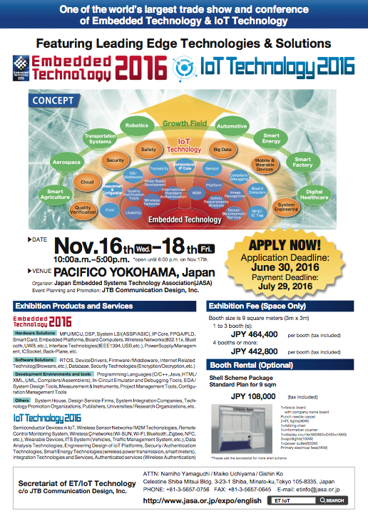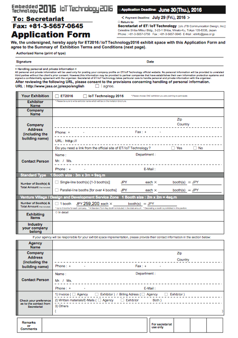 Application form shall be received by the Secretariat no later than June 30 (Thu.), 2016. * Applications will be regrettably declined if all booths are fully booked.
