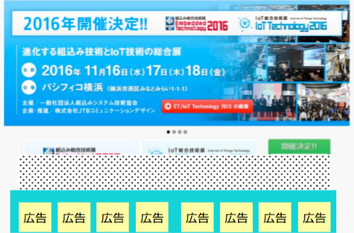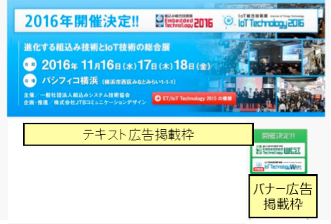 ET 2016 / IoT Technology 2016に関心をお持ちいただいている組込み業界・IoT(M2M)関連業界の方に、出展情報や最新の製品情報を発信できるテキスト広告です。 ET / IoT Technology Newsが配信されている、当該分野に関心の高い約75,000名の業界プロフェッショナルへの訴求に効果的です。