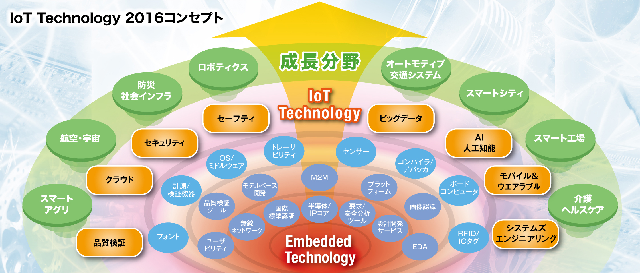 本格的なIoT時代を迎え、人やデータ・モノ・プロセスといったすべてが関連性をもつことで新しいビジネスビジョンが創造され始めました。IoT Technology2016は、その核となる組込みシステムの総合技術展Embedded Technology 2016と連動し、IoTの最新ソリューションを体感できる展示会として展開いたします。