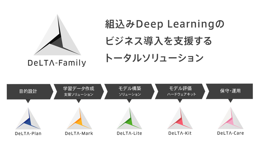 目的設計を支援する『DeLTA-Plan』、学習データの作成を支援する『DeLTA-Mark』、組込み向けのDeep Learningモデル構築を支援する『DeLTA-Lite』、ハードウェア上での評価を支援する『DeLTA-Kit』、そして保守・運用を支援する『DeLTA-Care』です。