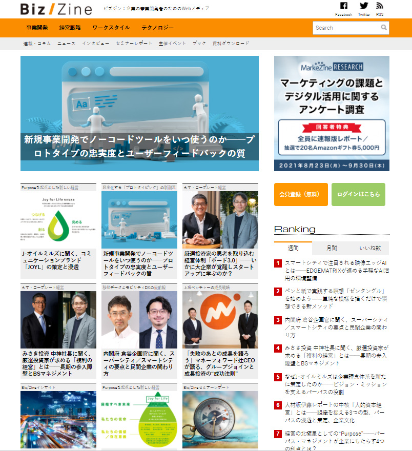 「Biz/Zine(ビズジン)」は、2014年11月に創刊した、事業と経営をデジタルで変革するリーダー・次世代リーダー向けメディアです。