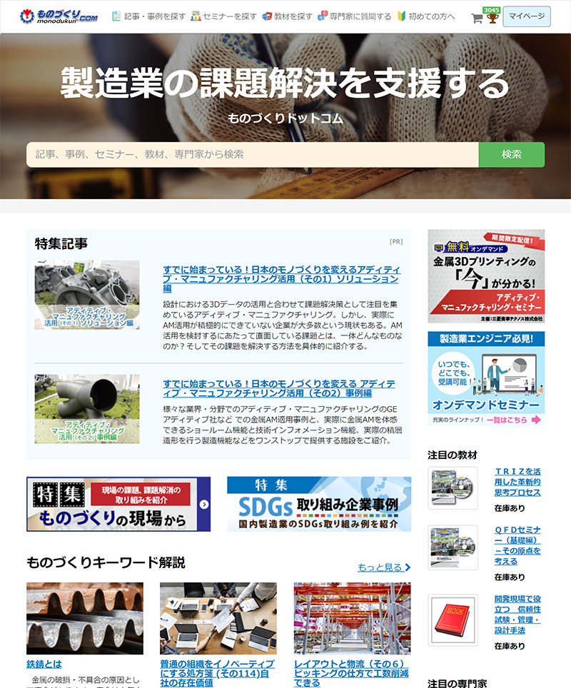 ものづくりドットコムは「製造業の生産性向上と問題解決を支援する」ことを目的に、技術的問題解決のヒントにつながる解説記事や事例約5,300本、技術・生産系セミナー約1,700本を掲載する、製造業技術者・研究者の為の日本最大級のポータルサイトで、累計560万人以上の皆様からご利用をいただいています。