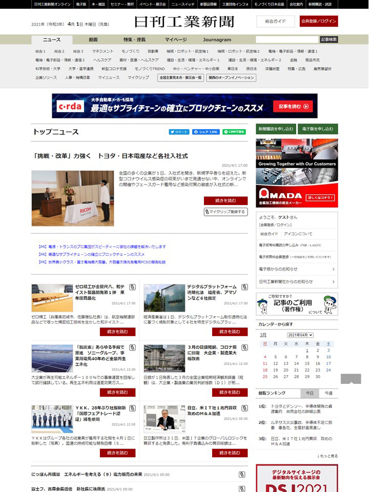 日刊工業新聞社のニュースをはじめとするコンテンツを、もっと新鮮に、親しみやすくお届けするサイトです。