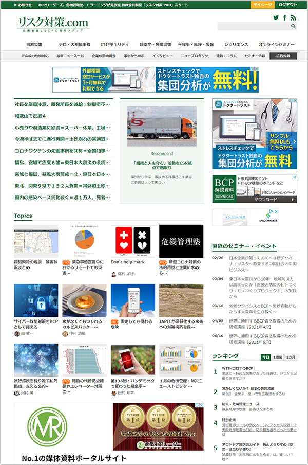 リスク対策.comは、日本唯一の危機管理とBCP(事業継続計画)の専門メディアです。2007年の雑誌創刊以来、日本唯一の危機管理とBCP の専門メディアとしてさまざまな企業や自治体を数多く取材。2017年にウェブメディアとして生まれ変わり、先進企業や自治体の危機管理、BCP や防災の取り組みをわかりやすく紹介しています。企業を中心とする危機管理・BCP の実務担当者へ、イベント情報や役立つ最新製品・ソリューション、全国の防災関連記事などを毎日配信しています。