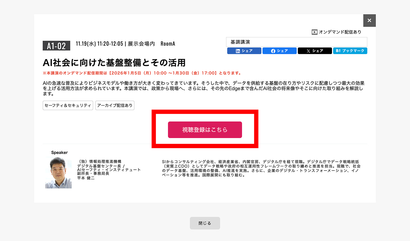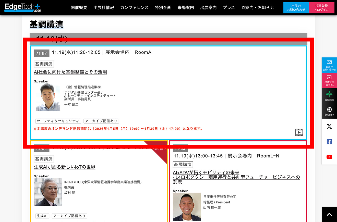 ユーザーマイぺージへログインした状態であれば、公式サイト上の各セッションの講演概要内にある<視聴登録・ログインはこちら>のボタンより、直接目的のページへアクセスいただけます(動画公開されている講演のみ)。
