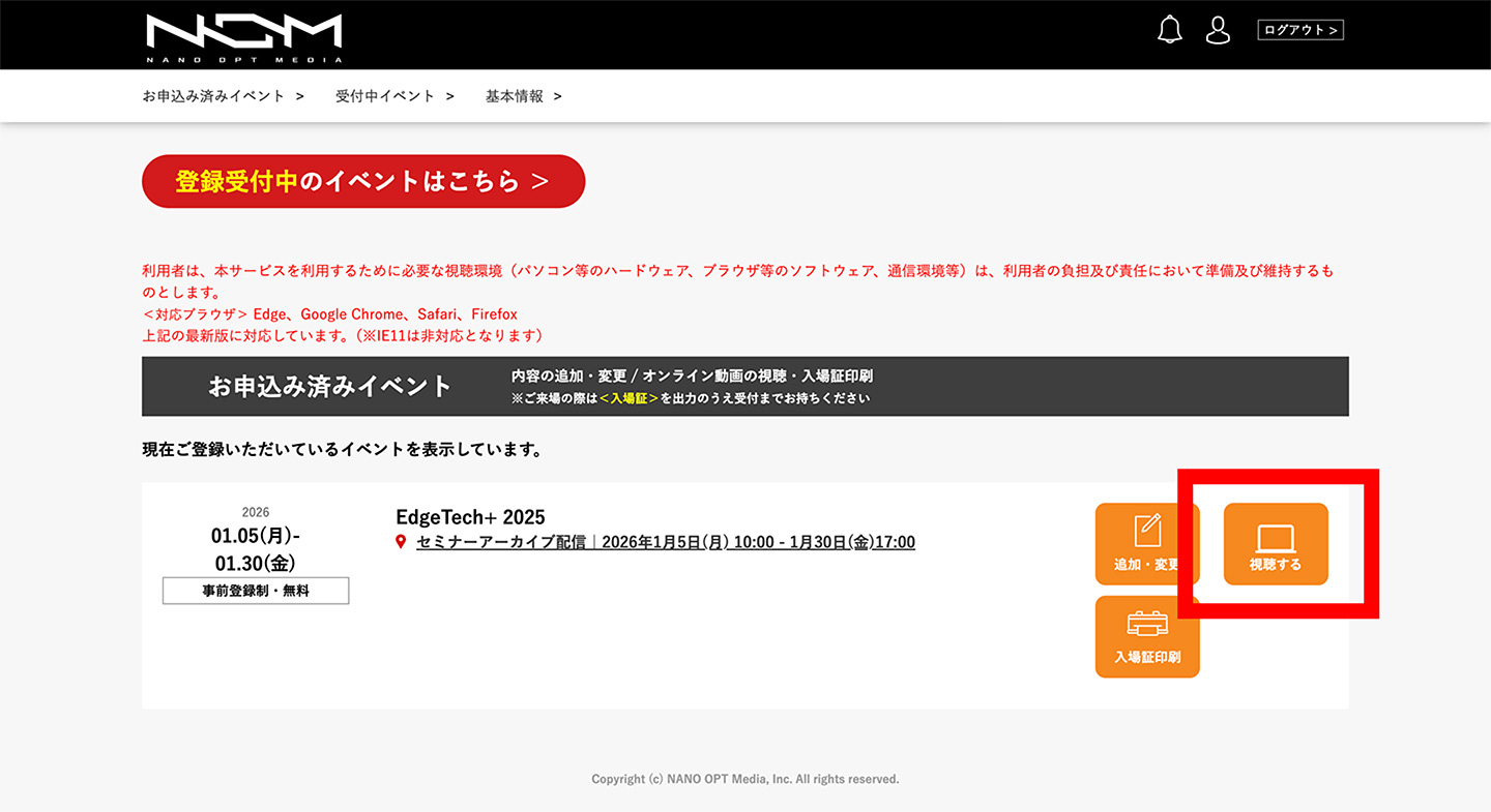 ユーザーマイページ上より、許諾のとれたセミナーをアーカイブ配信でご視聴いただけます。