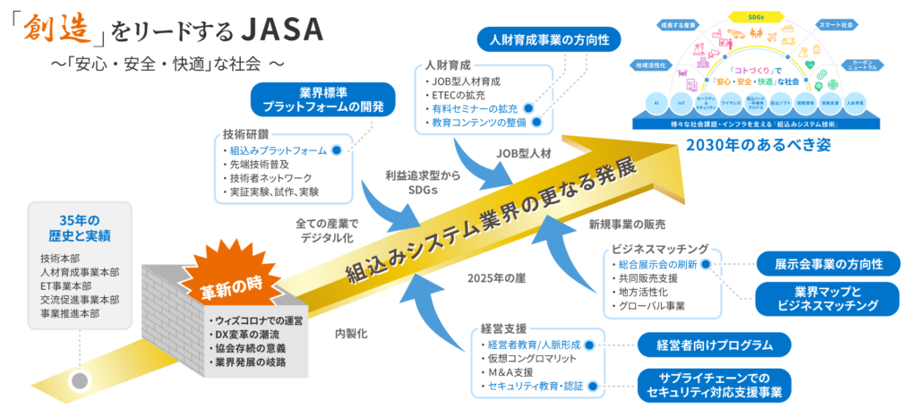 業界の変化に対応して、既存事業の修復と再構築を進め、新たな収益事業を具現化していく、必要な御柱としてSDGsにならい『JASAビジョン2030』を策定しました。
