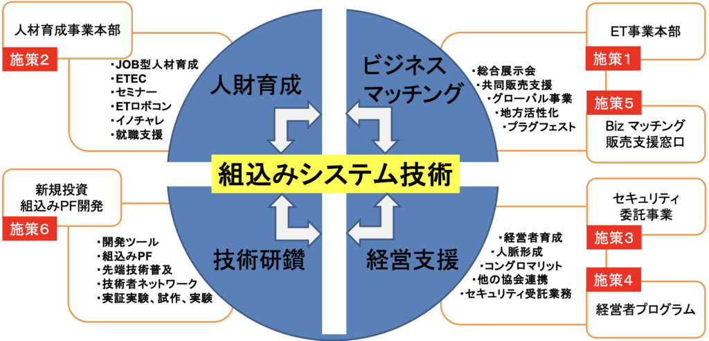 - 目的:組込み業界のユーザー企業からニーズ、シーズを吸上げ、JASA会員企業の新規事業、新製品、事業再構築などにより生まれたビジネスチャンスの営業活動を支援し、ユーザー企業へシステム提案、事業の立上げ支援を実施する